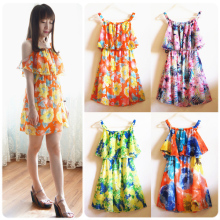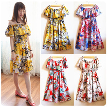 2017夏波西米亚荷叶边一字领露肩碎花雪纺沙滩连衣裙吊带裙短裙