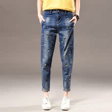 刺绣牛仔裤女九分裤新款潮水洗磨白弹力个性牛仔小脚香蕉裤子大码