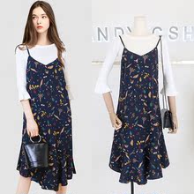 夏季新款时尚百搭宽松碎花印花吊带裙荷叶边连衣裙长裙女 CQ1D5