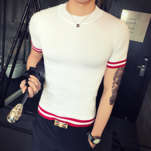 白DT02 P45 2017夏天 男装韩版条纹针织短袖T恤 男修身半袖打底衫