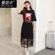 17新款韩版卡通字母印花中长款短袖t恤女显瘦藏肉蕾丝拼接体恤裙