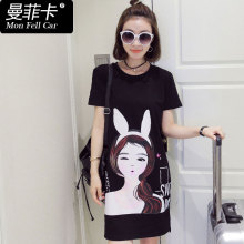 2017夏新款韩版卡通印花中长款t恤女休闲百搭长裙T恤裙大码裙潮