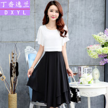 2017夏装新款女假两件雪纺连衣裙中长款OL气质收腰显瘦短袖裙子30