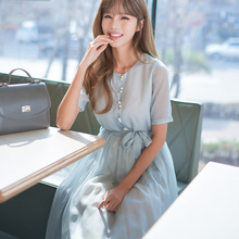 热销2017韩版圆领高腰纯色连衣裙夏季新款女装小清新纱长裙子秒杀