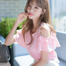 2017新款民族风女装夏露肩荷叶袖宽松纯色漏肩上衣粉色女t恤亏本