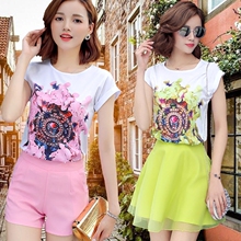 2017夏季新款女装印花雪纺衫裙裤时尚休闲修身两件套短裤套装裙子