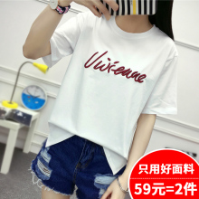 白色短袖t恤女纯棉韩版宽松上衣新款百搭圆领刺绣棉体恤衫女夏装