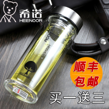 希诺双层玻璃杯 男士商务办公水晶杯子透明口杯 带盖泡茶杯水杯