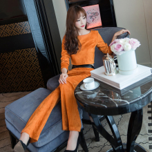 嫒色2017春季新款韩版时尚修身性感高腰长袖两件套套装阔腿长裤女