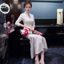嫒色包臀长袖2017春装新品长款白色修身复古旗袍蕾丝连衣裙长裙女