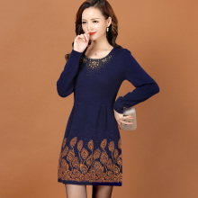 冬装新款女士羊绒衫中长款烫钻印花牡丹花连衣裙修身毛衣女