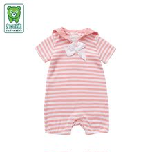 知了熊婴儿短袖连体衣全棉夏装女宝宝条纹爬衣背开扣短袖连身衣