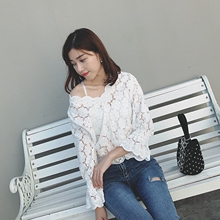 2017春夏款V领七分喇叭袖蕾丝衫性感露肩镂空蕾丝短款上衣打底衫