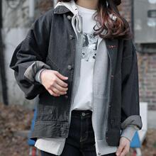 秋季女生黑色简约复古做旧宽松牛仔外套中长款纯棉BF风休闲小夹克