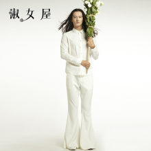 淑女屋秋装新款立领纯棉修身显瘦蝴蝶王子纯色商务休闲白衬衣