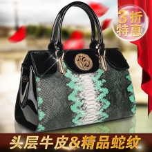 米思娜2017春夏新款真皮女包时尚头层牛皮蟒蛇纹印花欧美手提大包