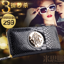 米思娜2017新品秋冬牛皮钱包女士鳄鱼纹钱夹长款拉链包时尚漆皮包
