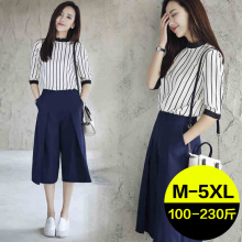 2017夏装新款加肥加大码女装胖mm条纹两件套阔腿裤套装时尚潮名媛