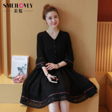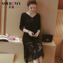 2017春装新款大码女装胖mm胖妹妹长袖黑色v领蕾丝鱼尾裙连衣裙女