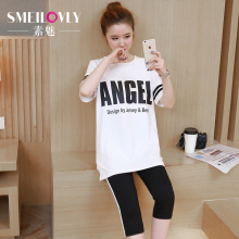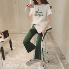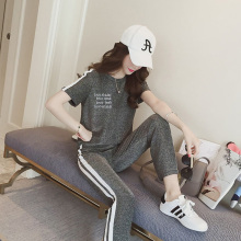 2017夏装新款大码微胖女装藏肉运动休闲字母短袖九分裤套装两件套