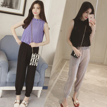 2017夏装新款大码微胖女装藏肉胖mm小香风无袖雪纺长裤套装两件套