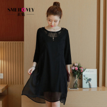 2017春装新款大码女装胖mm200斤胖妹妹黑色露背雪纺七分袖连衣裙