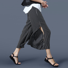 2017夏装新款加肥加大码女装胖妹妹黑白条纹雪纺阔腿裤九分裤子女