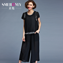 2017夏装新款韩版加肥加大码女装胖mm雪纺两件套阔腿裤套装时尚潮