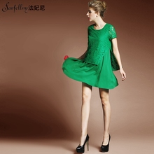 法妃尼2016夏装新款欧美高档时尚蕾丝拼接假两件绿色短袖连衣裙女