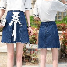 春夏新款韩版牛仔短裙女高腰显瘦大码a字纯色裙抽绳系带半身裙潮