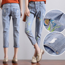 破洞牛仔裤女春夏新款宽松BF风刺绣九分裤显瘦哈伦小脚裤韩版潮