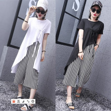 时尚短袖不规则长款上衣条纹宽松阔腿八分裤休闲两件套女显瘦套装