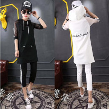 夏季连帽短袖长衫打底裤显瘦休闲套装女宽松潮流八九分裤两件套
