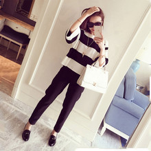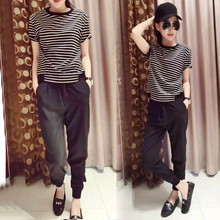 欧洲站2017夏季条纹短袖九分哈伦小脚裤时尚休闲运动套装女两件套