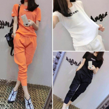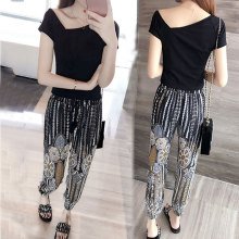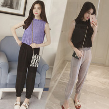2017夏季新款时尚九分哈伦裤两件套chic休闲褶皱雪纺套装夏女名媛