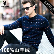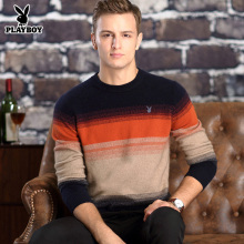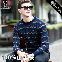 花花公子2016冬季新款羊绒衫男 冬加厚条纹针织羊毛衫圆领毛衣男