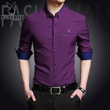 花花公子2017薄款长袖衬衫韩版青年男士丝光棉春款纯色免烫衬衣男