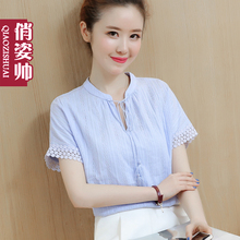 新款夏装短袖小衫2017女装短款修身蕾丝衫修身百搭镂空雪纺衫衣服