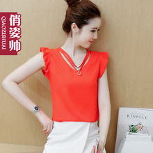 新款夏季木耳花边雪纺上衣无袖打底衫2017女装时尚T恤女装雪纺衫