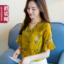新款夏季喇叭袖打底衫2017女装短袖上衣气质短款碎花雪纺衫衣服潮