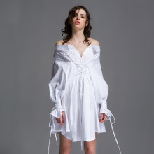 SYUSYUHAN设计师女装 打条工艺露肩腰封绑带宫廷袖纯棉衬衫连衣裙