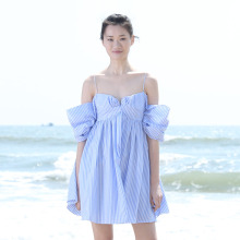 SYUSYUHAN设计 度假风 露肩纯棉大摆泡袖连衣裙 条纹