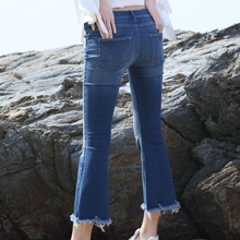 SYUSYUHAN设计 牛仔高弹显瘦毛边洗水做旧九分喇叭裤