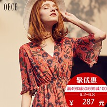 Oece2017夏装新款女装 复古印花V领荷叶袖碎花雪纺连衣裙夏FS036