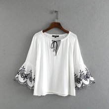 2017春夏新款呛口小辣椒波西米亚刺绣喇叭袖上衣雪纺衫衬衫