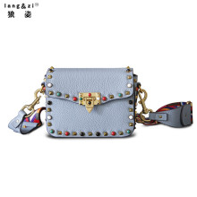 真皮女包2017韩版新款彩色铆钉小方包宽肩带斜挎包锁扣时尚小包包