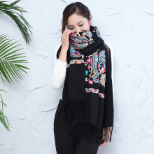 秋冬新款腰果花尼泊尔刺绣仿羊绒加厚黑色保暖女士绣花披肩围巾