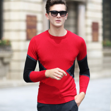 秋冬新款男士圆领拼接纯色纯羊毛衫 男式装薄款韩版修身毛衣男潮